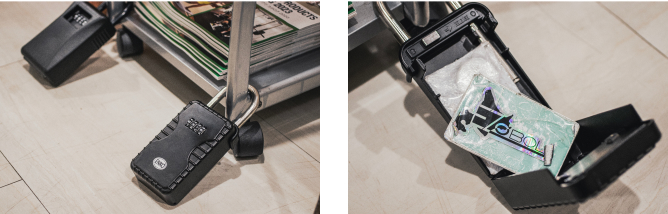 7階エレベーターが開いて正面にカタログスタンドがあり、そこにキーストックを引っ掛けております。ご予約完了時のメールに記載されている暗証番号を入力していただきますと【RMビル(レンタルジム)】のセキュリティーカードが入っております。