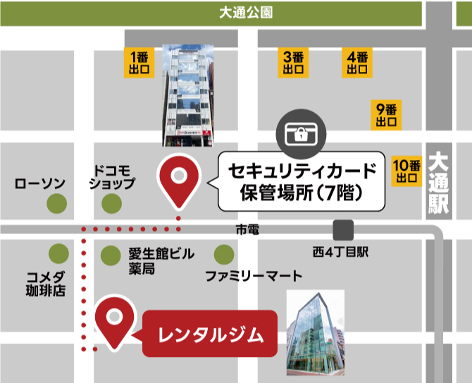 レンタルジムへ入るにはセキュリティーキーが必要です。お手数ですが、ご利用の前に必ずこちらのビルへお立ち寄りの上、カードキーをお持ちください。